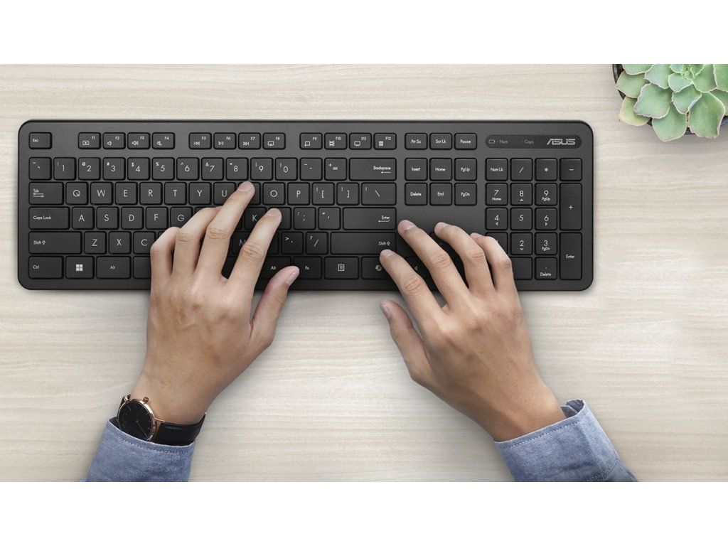 ASUS CW100 je bezdrátová klávesnice určená pro pohodlnou práci doma i v kanceláři. Připojuje se pomocí 2,4GHz USB přijímače, takže instalace je rychlá a jednoduchá bez zbytečných kabelů na stole.