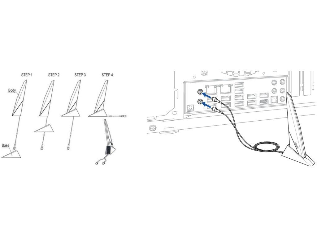 Tato externí ASUS WiFi anténa je určena pro základní desky a bezdrátové síťové karty s dvojicí RP-SMA konektorů. Pomáhá zlepšit příjem bezdrátového signálu a je vhodná pro použití s kompatibilními deskami ASUS i dalšími modely s odpovídajícím připojením.