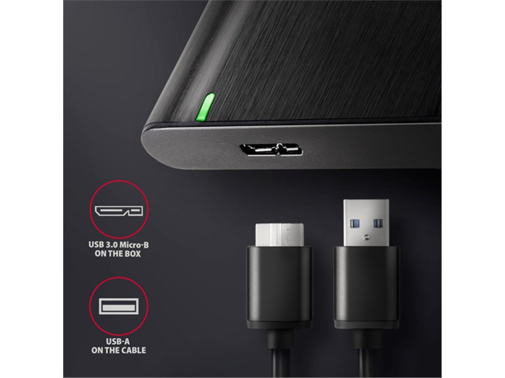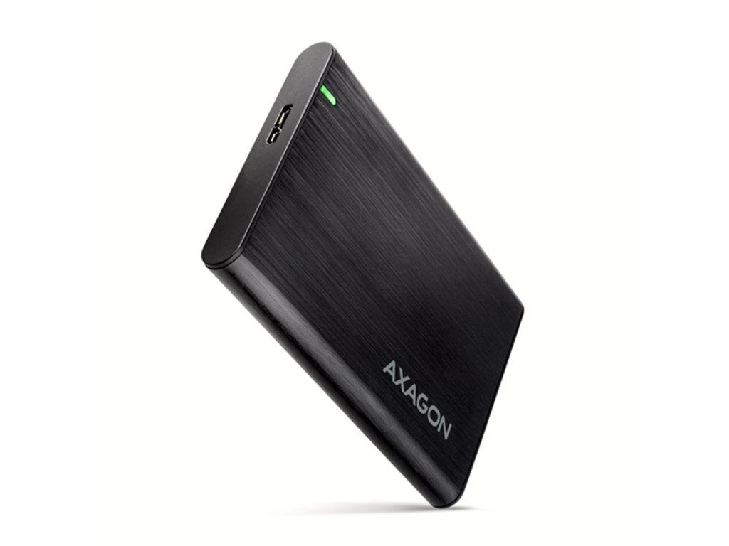 Bezšroubkový hliníkový externí AXAGON EE25-A6M RAW box s USB 3.2 Gen 1 (USB 3.0) rozhraním určený pro 2.5" SATA pevné disky nebo SSD. Připojení k počítači umožňuje USB Micro-B konektor na boxu spolu s dodávaným kabelem USB Micro-B -> USB-A.