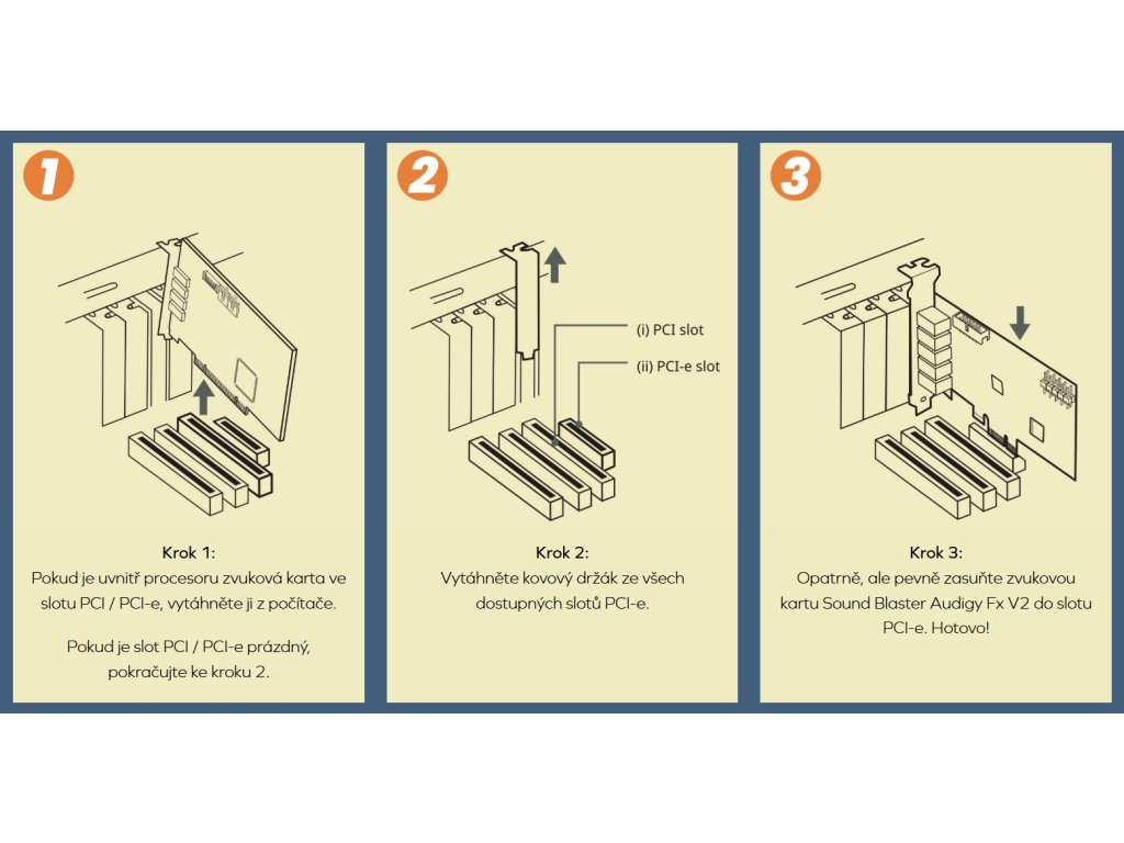 Hledáte zvukovou kartu, která vylepší zvukové schopnosti vašeho počítače a zároveň mu přidá i něco navíc? Pak byste mohli zvážit pořízení modelu Sound Blaster Audigy Fx V2. Tato 5.1kanálová karta nabídne pokročilé zpracování zvuku pomocí modulu Sound Blaster Acoustic Engine a k tomu přidává inteligentní komunikační funkce sady SmartComms Kit. Za zvukovou kvalitu hovoří vysoká hodnota odstupu signálu od šumu 120 dB (SNR) a podpora zpracování zvuku ve vysokém rozlišení 192 kHz / 24 bitů. Schopnosti této karty můžete dále vylepšit pomocí modulu Sound Blaster Audigy Fx V2 DBPro (prodává se samostatně). Ten nabídne například podporu přehrávání DSD64/128/256, dva kanály navíc pro 7.1kanálový zvuk a optický výstup.