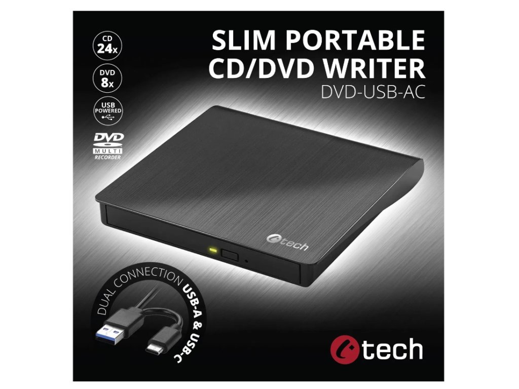 Je elegantní externí DVD vypalovačka, která se vyznačuje kompaktním a snadno přenosným slim provedením s integrovaným USB kabelem. Představuje praktické řešení pro PC a notebooky bez optické mechaniky. Mechanika se k zařízením připojuje prostřednictvím integrovanému kabelu USB-C nebo USB-A standartu USB 2.0. Kabel je integrovaný ve spodní části mechaniky, takže jej budete mít neustále k dispozici. Napájení celého zařízení je pouze přes tento integrovaný USB kabel. Externí DVD vypalovačka umožnuje číst a uložit si data na CD, stejně i na DVD s kapacitou 8,5GB pro dvouvrstvý disk a 4,7GB dat pro jednovrstvý disk. Vypalovat můžete rychlostí až 8 x v případě DVD a 24 x u CD. Podpora ochrany proti podtečení zásobníku navíc brání případným problémům. DVD vypalovačka podporuje nejen standardní 12cm CD a DVD, ale také jejich 8cm mini varianty. Mechanika podporuje Plug and Play standart, takže ji stačí pouze připojit k zařízení a počkat na automatickou instalaci ovladačů a následně začít mechaniku plně využívat.