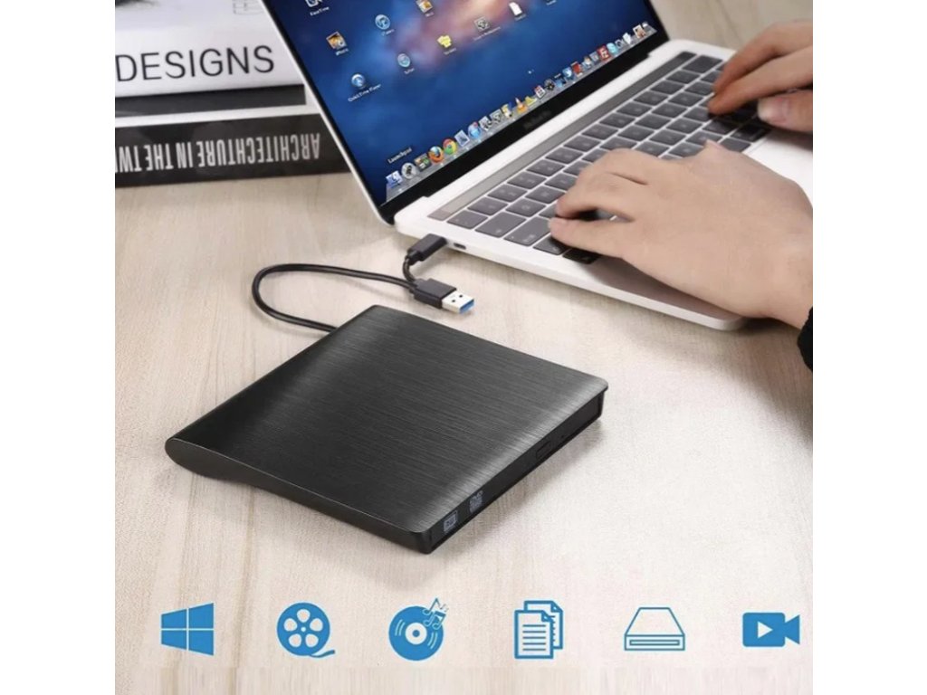 - Externí vypalovačka zvládá číst a zapisovat data na DVD a CD