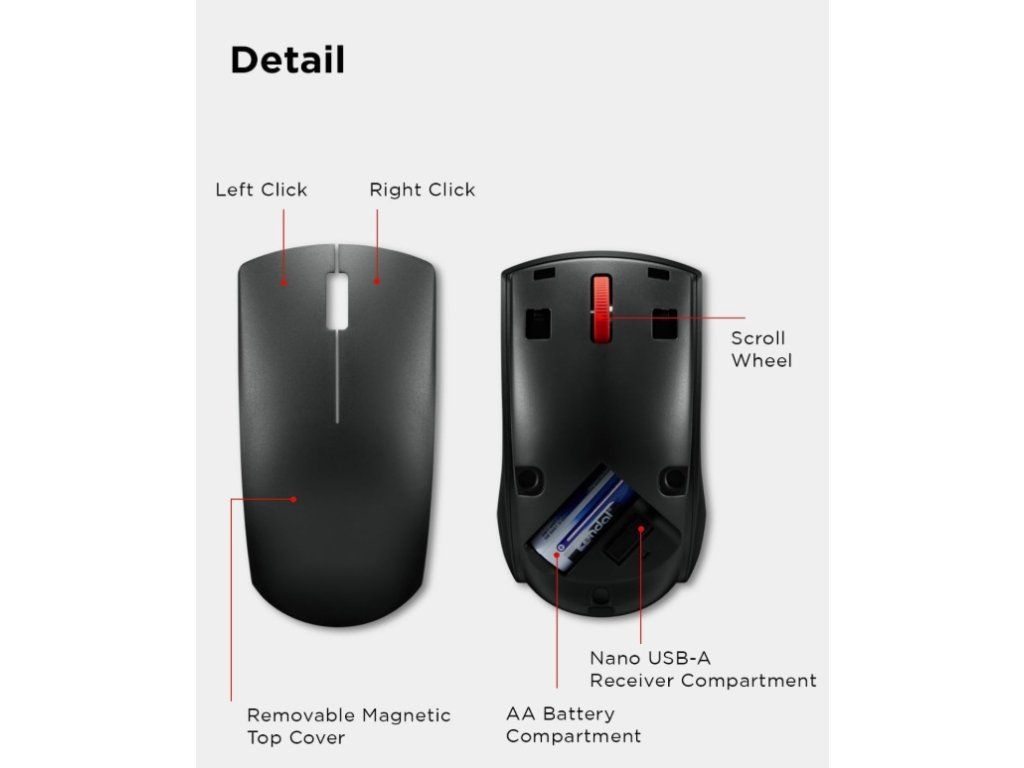Myš je navržena pro snadné každodenní používání bez složitého nastavování. Stačí připojit USB přijímač a můžete ihned začít pracovat. Bezdrátové připojení přes 2,4 GHz nabízí stabilní spojení a volnost pohybu bez omezení kabelem.