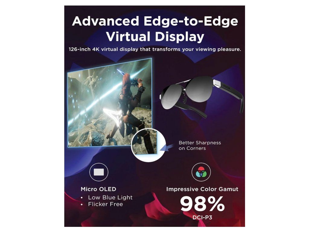 Lenovo Legion Glasses Gen 2 vytvářejí před vašima očima virtuální obrazovku o velikosti až 126", což odpovídá sledování velké televize z několika metrů. Díky Full HD rozlišení a Micro OLED technologii je obraz ostrý, kontrastní a plný detailů.