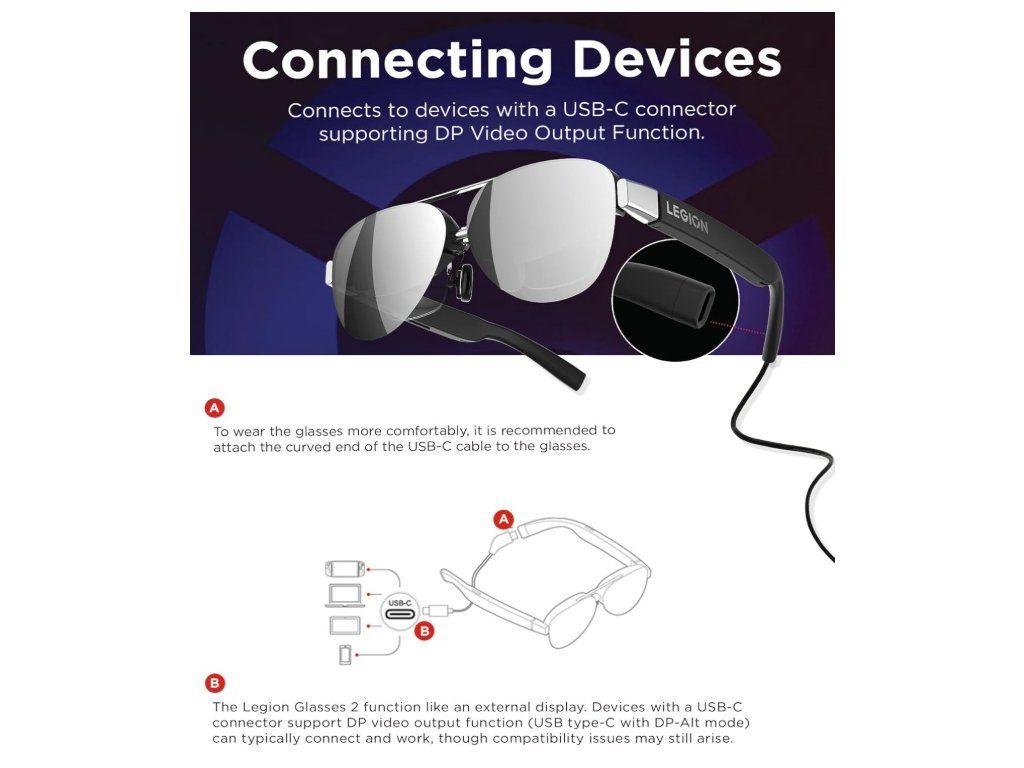 Brýle fungují jako externí displej – stačí je připojit k zařízení pomocí USB-C 3.2 s podporou DP 1.2 (DisplayPort Alt Mode) a ihned zobrazují obraz.