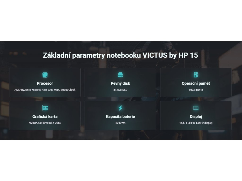 VICTUS by HP 15 je skvěle vybavený herní notebook, který šikovně těží z nejnovějších hardwarových vychytávek. Procesor AMD Ryzen 5 7535HS přináší prémiové zážitky s vysokým výkonem a dlouhou výdrží baterie. Do výbavy VICTUS by HP 15 patří také grafická karta GeForce RTX 2050 nebo vynikající 144Hz displej.