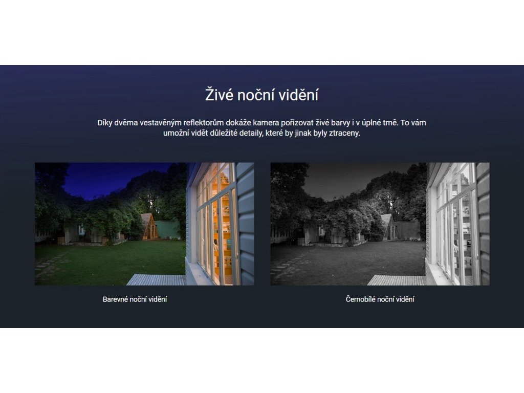 Kamera je vybavena inteligentní detekcí lidského pohybu a automatickým sledováním, které se zaměřuje pouze na relevantní události. Vestavěné reflektory umožňují barevné noční vidění a v případě detekce pohybu může kamera aktivovat světelný a zvukový alarm pro okamžité odstrašení.