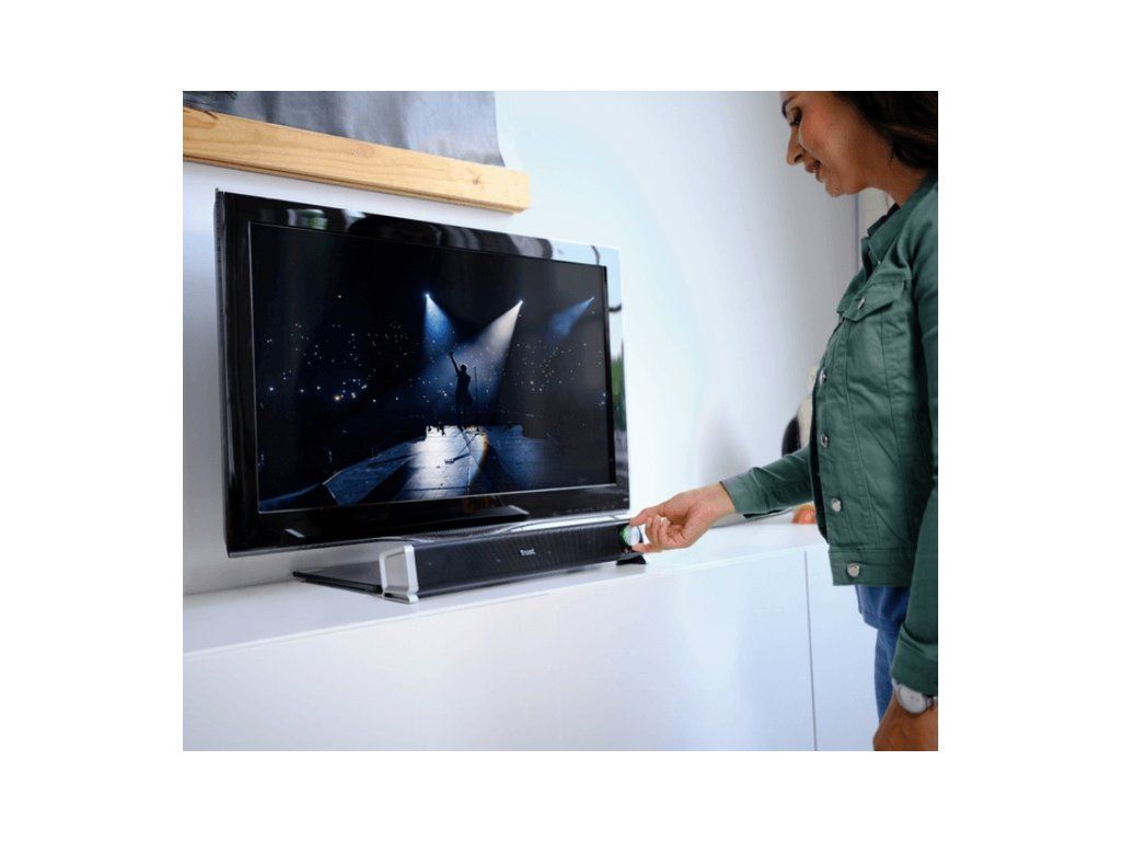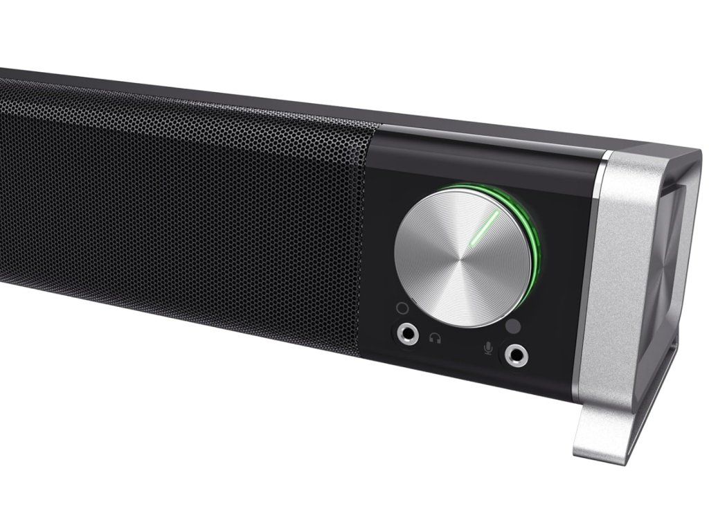 Soundbar je navržen tak, aby zabral minimum místa na stole. Díky svému nízkému a úzkému provedení se pohodlně vejde pod většinu monitorů a televizí, aniž by překážel.