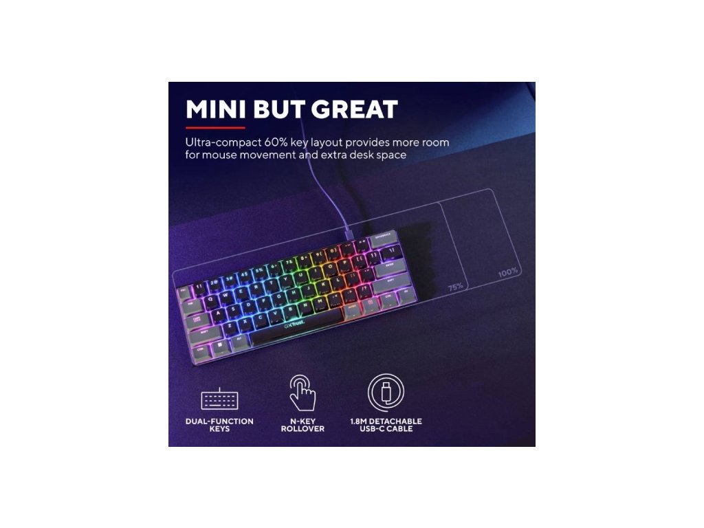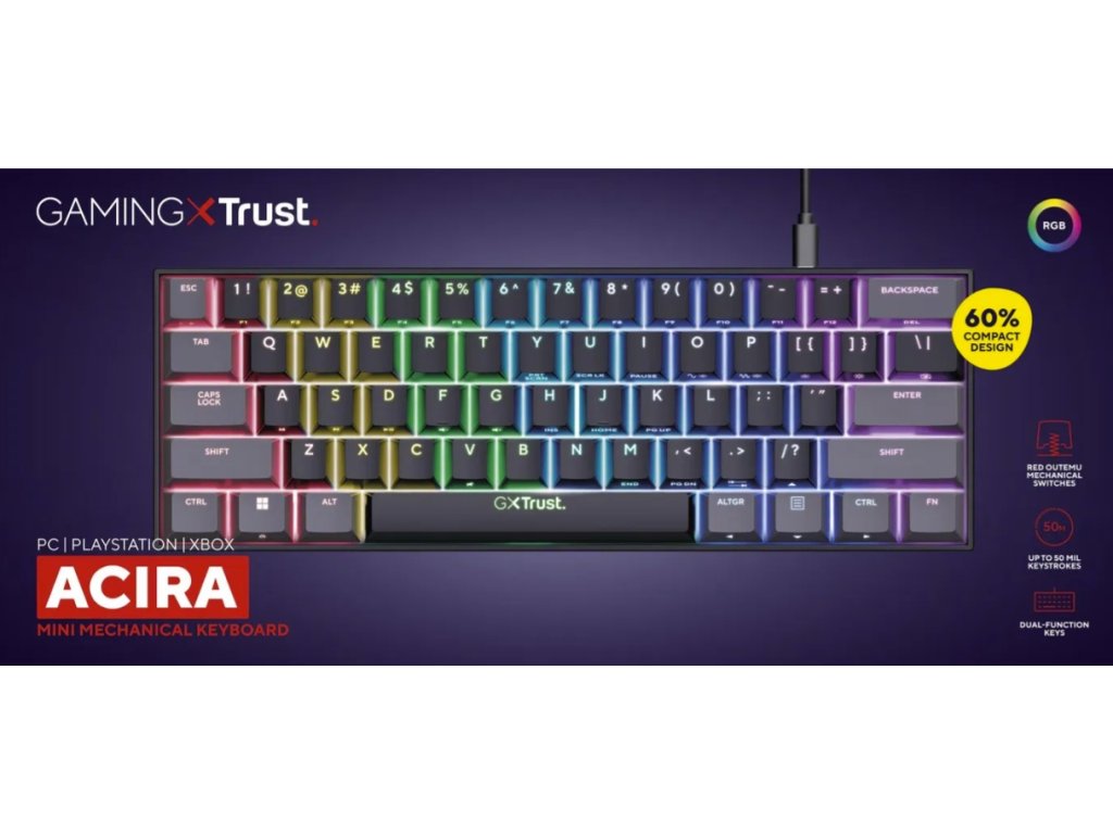 Trust GXT867 Acira je malá herní klávesnice s neuvěřitelným výkonem. Její ultra kompaktní 60% design poskytne více prostoru pro pohyb myší a ušetří více místa na herním stole. Dvojí funkce kláves a N-key rolloverem zaručí, že každý stisk bude zaznamenán přesně tak, jak má. Odnímatelný USB-C kabel pak umožní snadné přenášení.