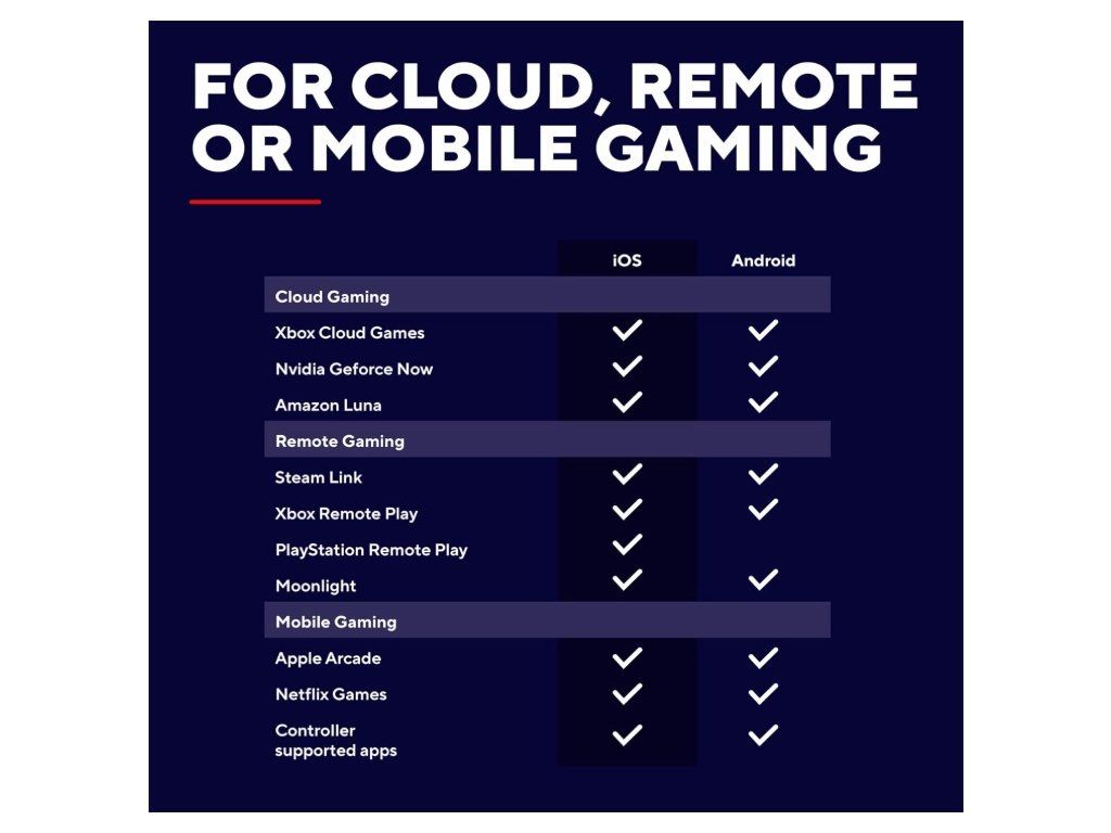 Ovladač je kompatibilní se smartphony s operačním systémem iOS i Android, takže jej snadno využijete pro mobilní hry podporující ovladače. Lze jej použít také pro vzdálené hraní a streamování vybraných her z konzolí. V případě hraní přes Remote Play je potřeba mít nainstalovanou příslušnou aplikaci. U zařízení PlayStation je tato funkce dostupná pouze pro iOS.
