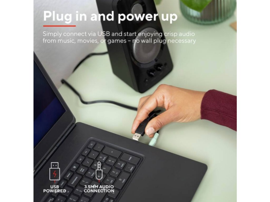 K připojení a bezchybné funkčnosti nepotřebujete reproduktory zapojit k elektrické síti. Energii jim dodáte jednoduše přes připojený USB kabel. Pro přenos zvuku potom stačí zapojit druhý kabel s 3,5mm Jack konektorem opět do těla počítače nebo notebooku.