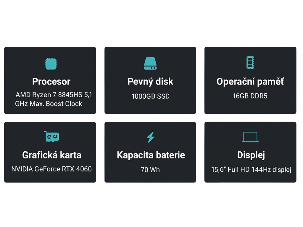 - AMD Ryzen™ 7 8845HS – výkonný 8jádrový procesor pro hry i náročné aplikace.